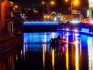 「青の運河」に合わせた青色イルミネーション装飾をした船で運航する運河クルーズの「ナイトクルーズ」も大人気です。